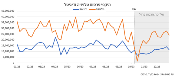 בתחום הפרסום, ניכר כי מלחמת חרבות ברזל, שפרצה בשביעי באוקטובר, השפיעה על המפרסמים באופן מהותי. התקציבים שהושקעו בקמפיינים הצטמצמו משמעותית, בעיקר כאשר מדובר על התקופה שלאחר החגים, המתאפיינת בדרך כלל בנסיקת תקציבים; לאור האירועים השונים, וההשפעה שלהם על מצב הרוח הלאומי, היינו עדים לעצירה כמעט מוחלטת של הפרסום בטלוויזיה, ולאחריה חזרה איטית והדרגתית שנמשכת עד היום. לצד זאת, מעניין לגלות כי ההשפעה של המלחמה על תקציבי הפרסום בדיגיטל היתה מצומצמת יחסית, והירידה בתקציבים הקשורים בכך היתה פחות דרמטית.